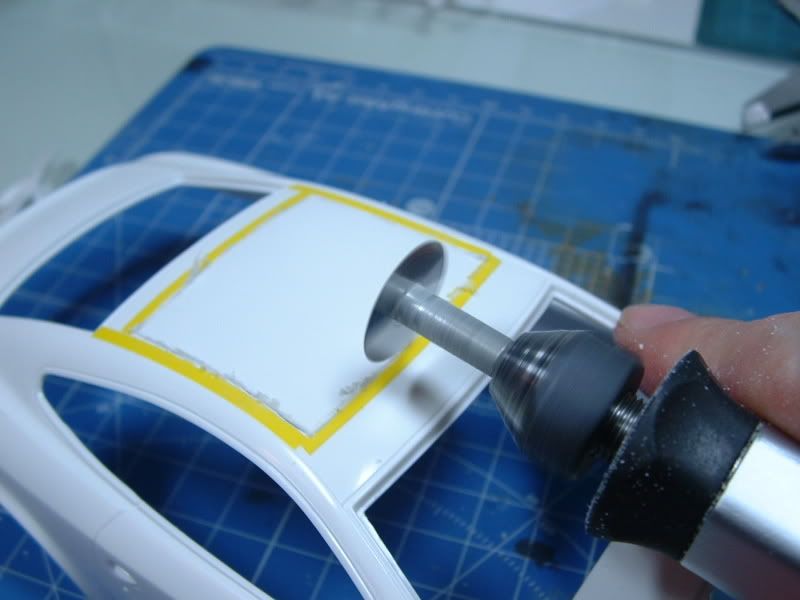 The roof was marked out and cut with circular saw in a motor tool. BTW, I highly recommend buying a motor tool with a seperate transformer with adjustable speed. Its a recent purchase of mine and I dont know how I managed without it! It provides so much more control. Although not pictured in detail, once the opening was cut, the remaing plastic was milled away to a depth of 20thou or so for the new glass roof to sit flush.