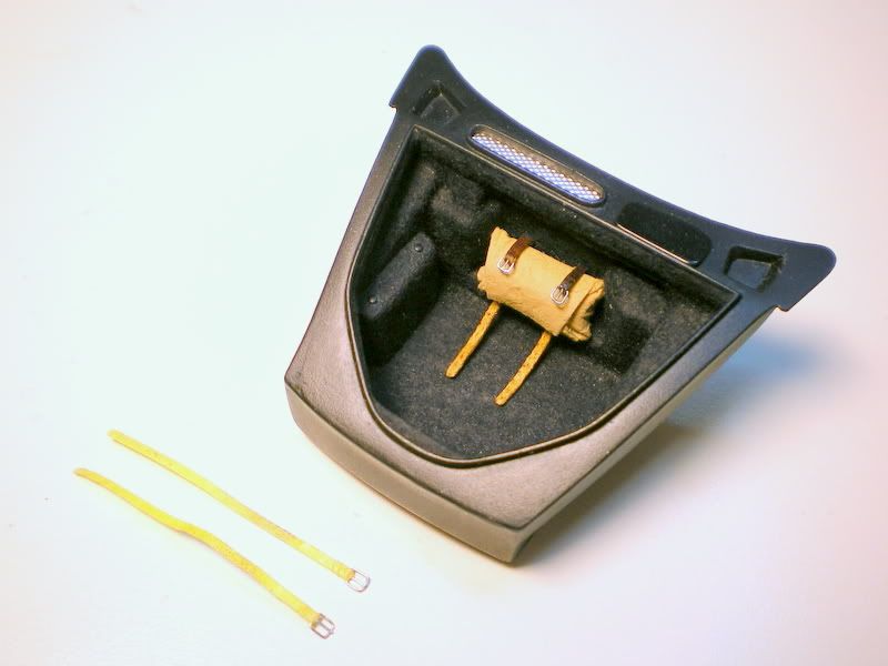 So after all that messing with masking tape for the belts, and contemplating the horror of painting same, it dawned on me that it would be a lot easier to just go with leather. And indeed it was - quite easy to work with and looks much better. The tire repair kit is air-brushed coffee filter paper.