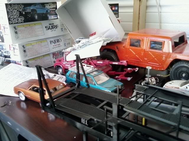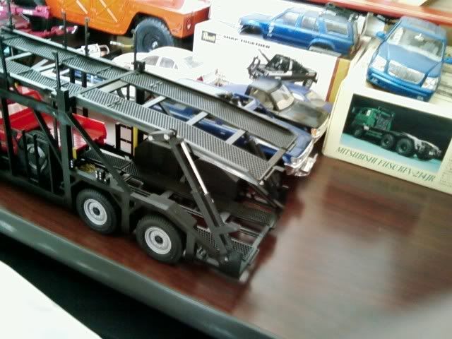 Just about finished with the Mitsuwa car hauler trailer. Kit went together nice and easy, just like my other one. Painted in Dupli-Color black, with silver accents. Painted the hydraulic rams silver, the cylinders yellow except for the two rearmost. I still have to put on the landing gear and cables that span the upper decks but it's otherwise complete. Now to build some riders... I think the Revell Pete 359 will be the tow rig. Please forgive my messy work area...