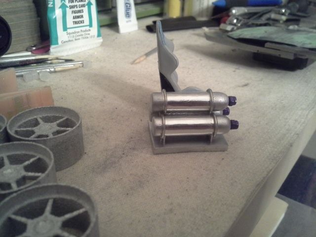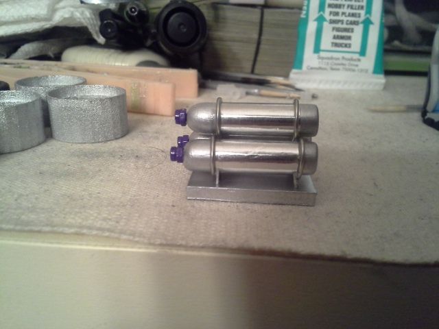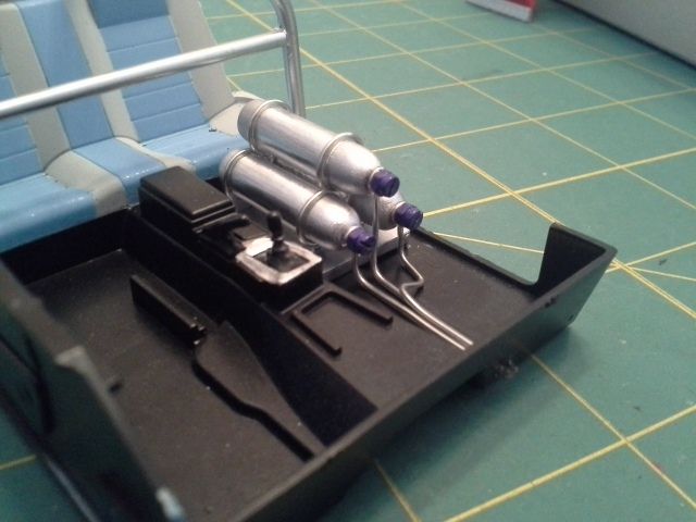 starting on finishing the interior. Tanks are made from wood dowel. Wrapped in silver tape and wires for the holders.