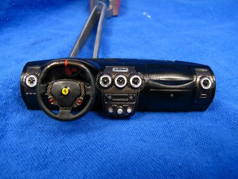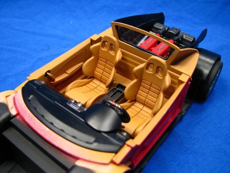 Here are the seats and dash. The tan is a custom mixture of Tamiya sand and orange, and I applied a wash of dark brown in the seat crevices. The dash has SMS carbon-fiber decals cleared with Tamiya smoke. The finish on the steering wheel is kind of crummy so I may re-do it.