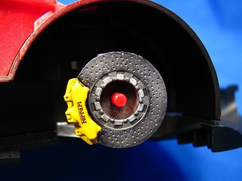 I've basically gotten the chips worked out. I sanded the immediate area around the chips with 1500 grit sandpaper, making sure to make a smooth transition. I made another mask (and crossed my fingers it wouldn't pull up the paint!) and repainted the area like usual. After the paint had cured for about a week I leveled it all out with 4000 grit Micromesh and polished with Tamiya coarse compound. I've also gotten work on the rest of the car done, namely the engine, interior, and chassis. The engine is very shallow, but represents the engine well if you're not studying the model. Everything was painted according to my references, and the Ferrari scripts on the intake are Crazy Modeler photoetch. The interior is mostly done, I just need to add the handbrake and seat belts and it's done. The kit comes with Enzo-style brakes, and carbon-ceramic rotors are available as an option on the F430 so I decided to paint them with a mixture of black and gunmetal to represent this. The calipers are painted yellow because I like them that way. :) I then mocked-up everything to get a sense of how it will look when I'm done!