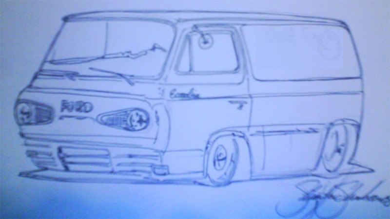 Hey everyone.. I just picked up a 61 Econoline a couple weeks ago and am going to be doing alot of work on it. It got me in the mood to draw one last night..so while I was at work i inked this one out. Unfortunately it is not PERFECT.,. as I only had ink and hate to do initial sketches in ink... errors show!!! Anyways... I cant wait to build the real thing.. and maybe get some C&C on my artwork. the pic is not the greatest used my Ipaq camera...