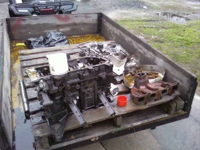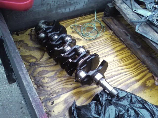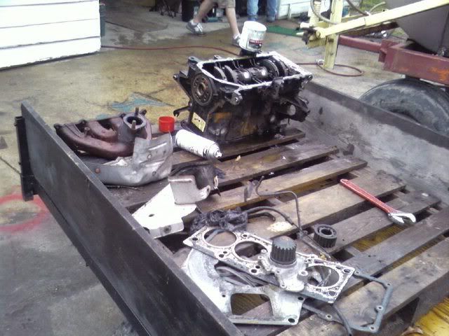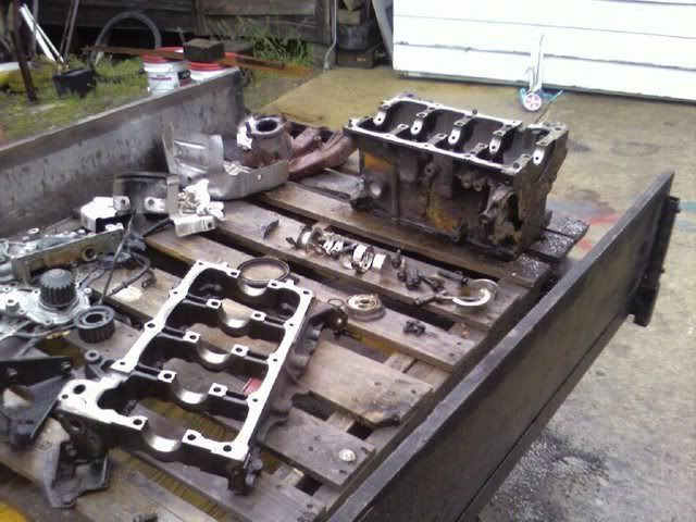This weekend went pretty good. Got most everything done that I needed to. Saturday I went to my buddies house to work on the motor some more. Got everything off the block and the crank out. Didn't get the block cleaned up any, I am just going to let the shop bead blast it to clean it up some. My dad will be taking everything to the shop this week and then it will be ready for assembly. Timing belt also came in on Friday. I need to find out how much the machine shop is going to charge me before I order the rest of the parts. Here are some pics from this weekend. It rained pretty much all weekend, today turned out to be nice but we had to tear this thing apart in the rain.