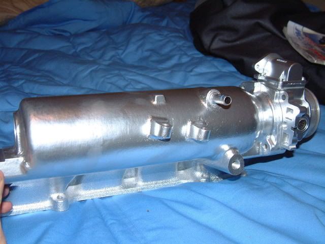 So here is the intake finally finished and painted. Im to lazy to polish out everything to a shine so I just painted everything. I used a chrome/silver paint. The intake manifold was sanded down smooth on the parts you can see. This is probably just a temporary setup, I see how long it last and when it starts to look really bad I will just get the whole thing powdercoated more than likely. The finger prints are just smudges that wipe off.