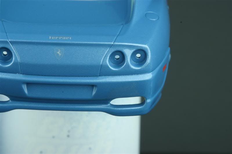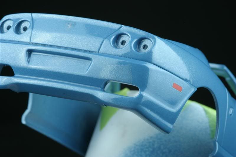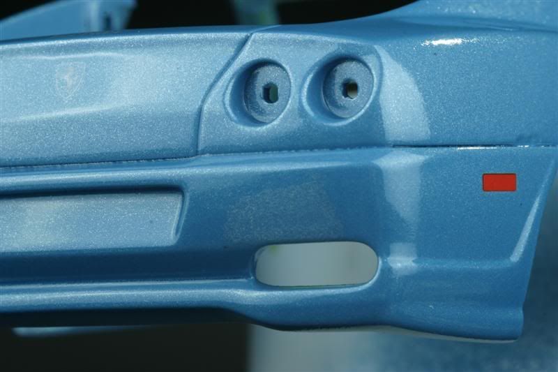 That's a shame because it's such a nice paint job as well.It looks like the clear coat may have slightly eaten into the colour coat and taken away some of the pigments,then pooled up and resettled which gives it that patchy appearance.Maybe you could mask and repair and respray the whole rear bumper as Ray suggested.You could make some new decals from plain red decal sheet for the side markers?