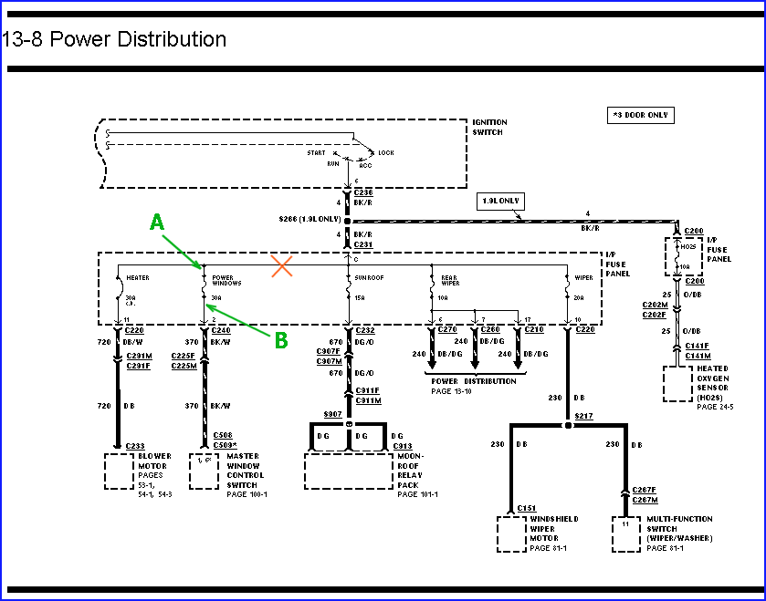 Therefore I think you have an open-circuit fault within the fuse panel itself, at the point where I've marked a red cross, below. If that point was open-circuit, and you then did what you mentioned above - remove the power window fuse and apply voltage from a jumper lead to the point which I've marked 'A', then your blower motor would work. If you then applied your jumper to the point marked 'B', then your power windows would work, which is exactly what you have described. If your wipers are working normally, then that's my best guess as to what the problem is - internal open-circuit within the fuse panel.