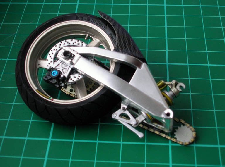 Thankyou everyone for your remarks, far too kind! On the chain, joel, I didn't really do anything that different to what I normally do, I think maybe my wash was stronger and it looked much better for it. I primered it first then sprayed metallic grey avoiding the sprockets as much as possible, didn't bother masking though, than I sprayed the sprockets a greeny gold colour (again no masking just careful airbrushing), colour was mixed with vallejo metallic paints, although I normally use tamiya but there is a huge shortage of them in the UK at the moment! I gave the sprockets a wash with thinned down Metallic grey and flat black. next I gave the chain a wash with slightly heavier wash of same colour. finally I picked out chain links in gold and rivets in silver, also painted bolts on sprockets silver. I think I may of give chain a second light wash at the end also! was really pleased with results though especially on photo, you can never see the same detail with the naked eye!