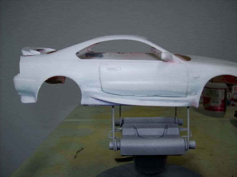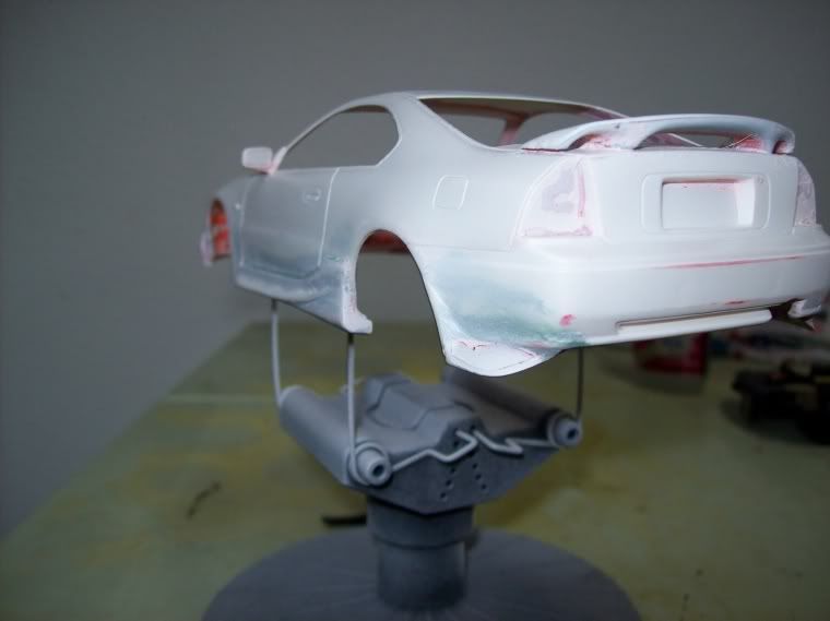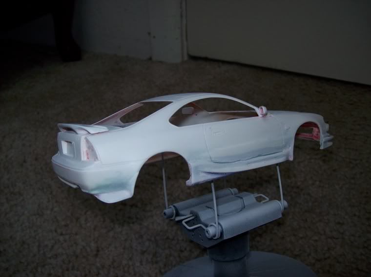 I built this model several years ago and it was my first attempt at a custom body kit. I still think its one of the best Ive done. But the paint was a miserable failure. I was broke but desperate to build so i looked into paint removal. I found some stuff called Castrol Super Clean. It was fan-friggin-tastic. Removed the very heavy paint without touching glue joints or indeed the putty. Never scrap a model again. anyway this is what it looks like now I dont have any sanding materials now so its rough but it will soon be sexy. (and what i wish my 1:1 looked like). I couldnt get a non-blurry pic of the rims but they are the mugen style rims from an s2000 deepdished painted gunmetal with a polished lip. Looks sweet i hope it looks good with red paint. The body peices came mostly from an rx-7 but its been so long i cant really recall?