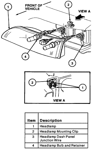 Remove three headlamp mounting clips retaining headlamp to radiator grille opening panel reinforcement. NOTE: Use snap-ring pliers to spread headlamp mounting clips, then pull straight upward to disengage.