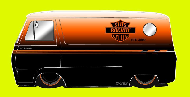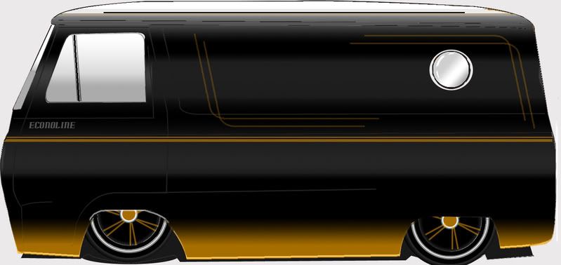 I spent yesterday afternoon messing around with photoshop, and trying out some color combos with my van. here are a couple of different schemes. The top one although would not include the logo, i figured looked alot like a HARLEY-FORD partnership I had to add the logo. I do like the colors though. The bottom one, just a flat black with gold trim.. initially i was just going to do a rat rod scheme... but am now looking at other possibilities..