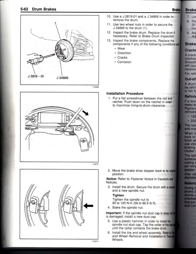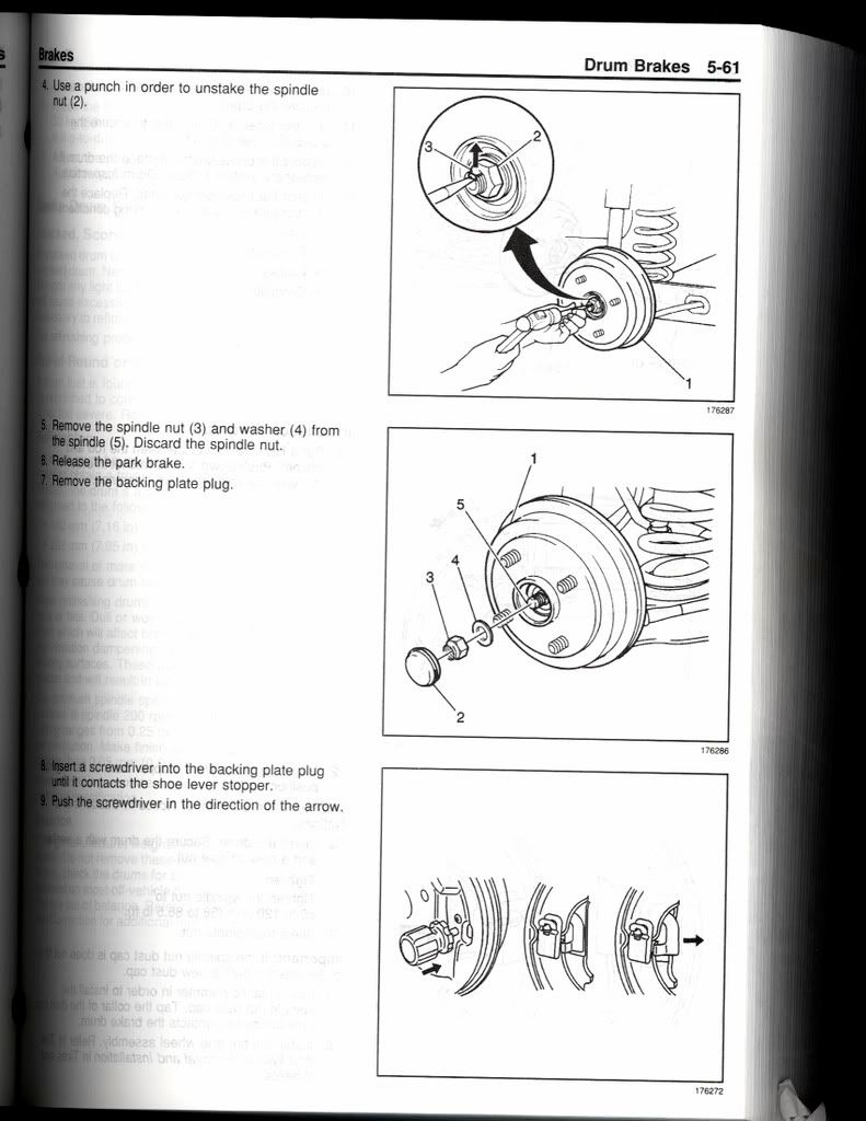 I wanted to check the thickness of my brake shoes today. I could not remove the drums. I removed the two retaining screws and could not budge the drums. I tried relieving the tension by pushing through the small hole on the back with a small screwdriver also. I believe on this model there is no need to remove the hub nut.