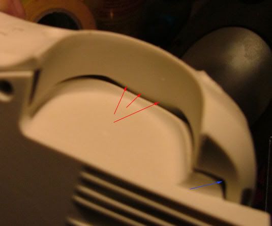 First, sand down the area marked with red arrows (Inside the body)...This will give you a tighter fit between the chassis and the body. Then, use some putty to fill the space marked with a blue arrow. I recommend to leave a 1 mm gap between the chassis and body. You will need this space to apply primer, paint and carbon fiber.
