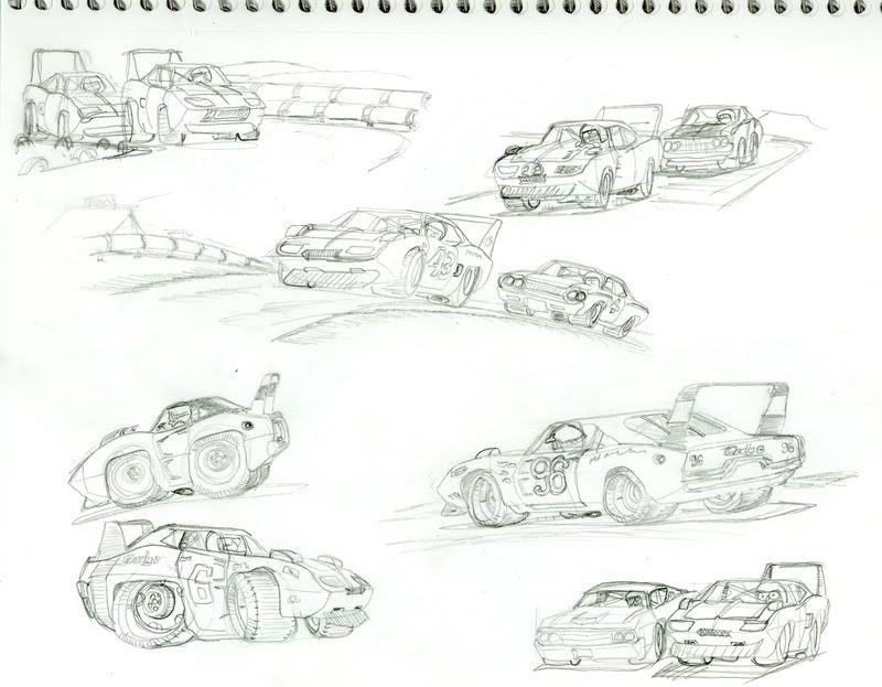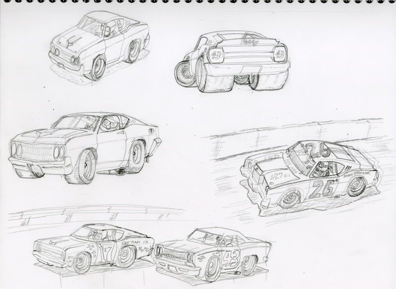 Okay, finally scanned these doodles. Used a ref article about stock car racing at the