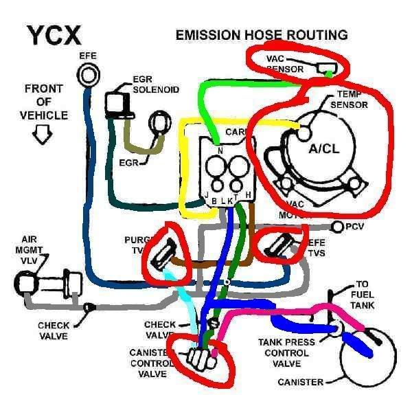 The canister control valve may be mounted on a bracket that's mounted to the alternator in turn, or it may be free-floating 'in space', in the same area. This is generally in front of the coolant thermostat housing. The EFE TVS is mounted on the coolant thermostat housing and the purge TVS is mounted on the intake, in front of and between the alternator location and the thermostat housing. The vacuum sensor, also called a MAP sensor, is mounted on a bracket on the passenger side of the intake manifold, between the carb and the dist.
