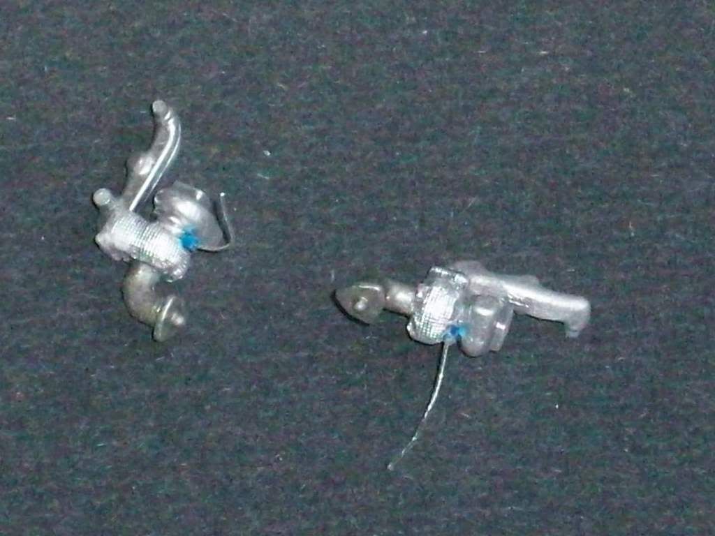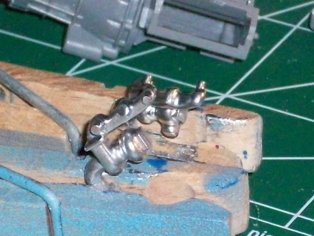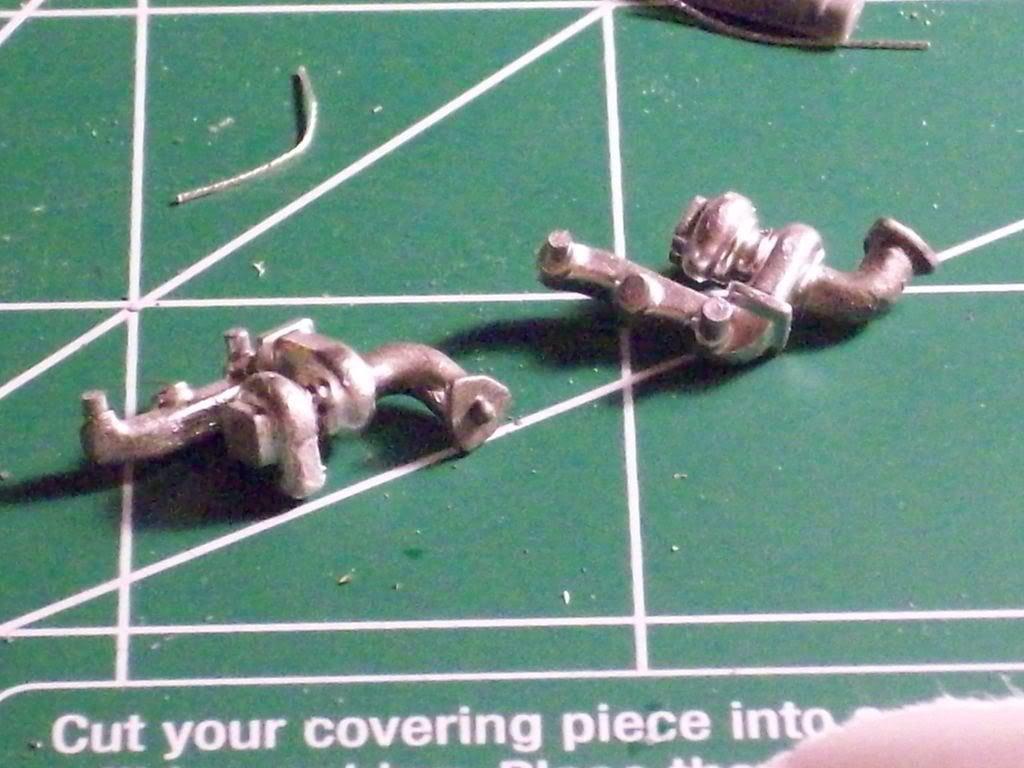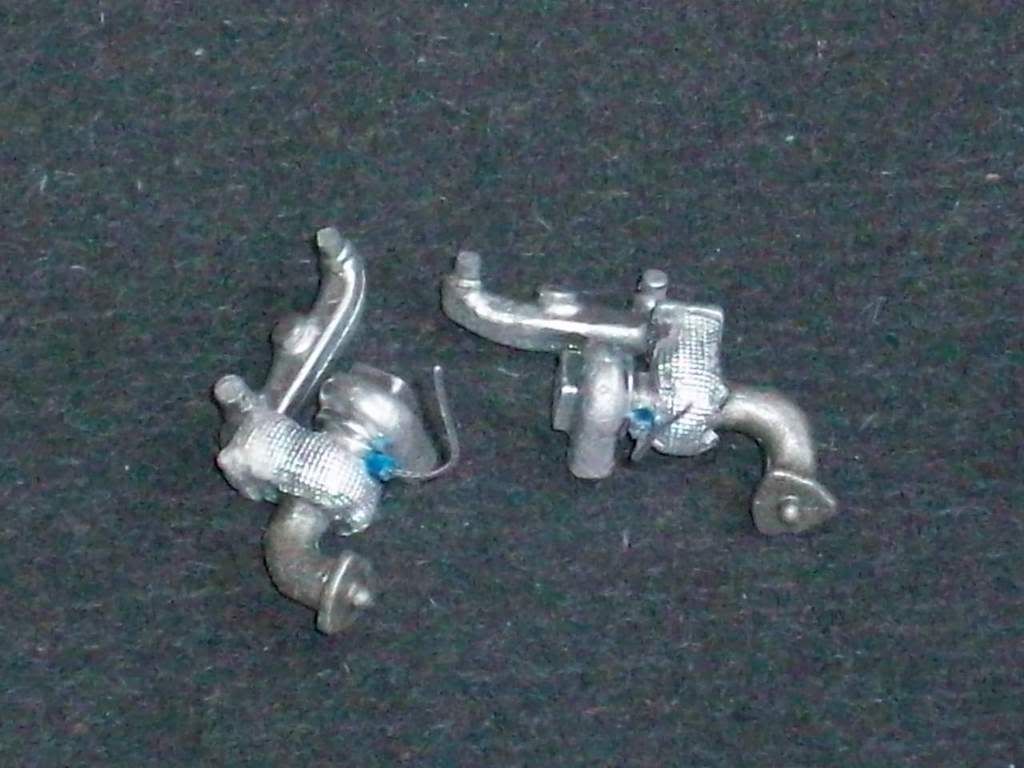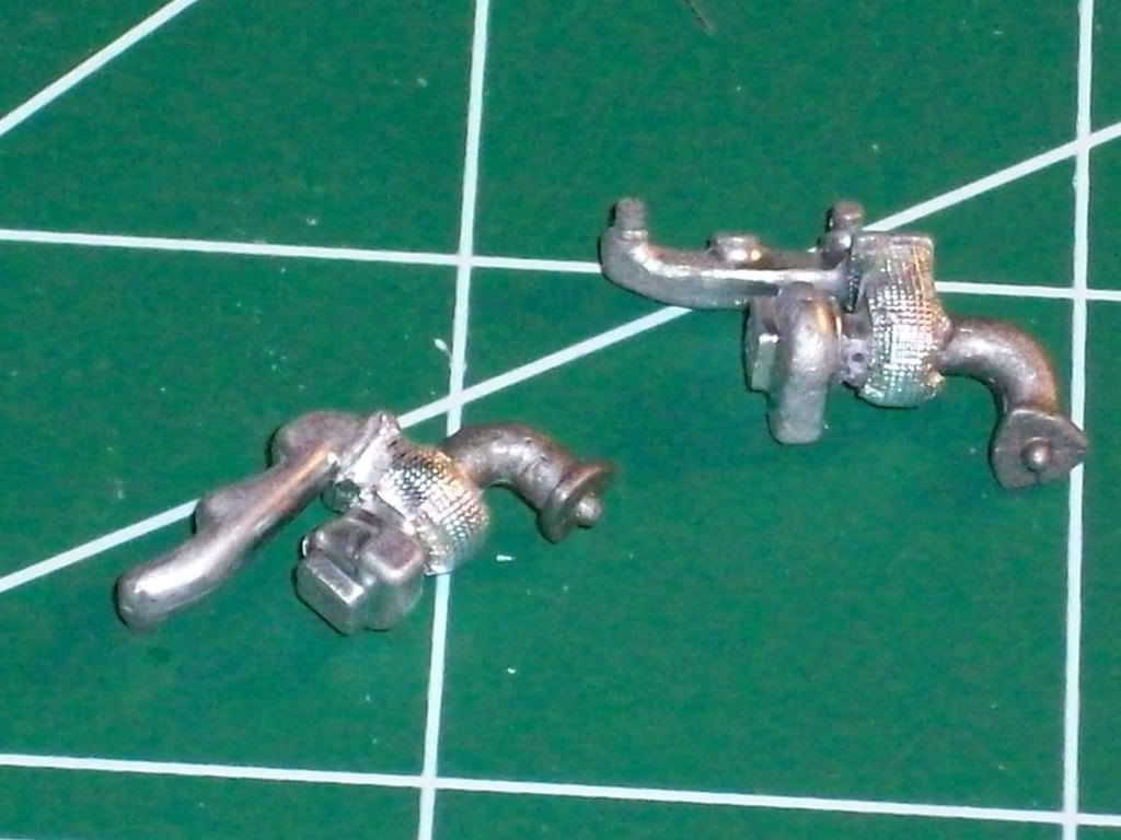 I'll trim those long "legs" when I decide exactly how I'm going to plumb these. I'll probably bend them into 90* fittings and run braided line from them. I'll also run a black wash into the grooves as soon as the silver paint dries.