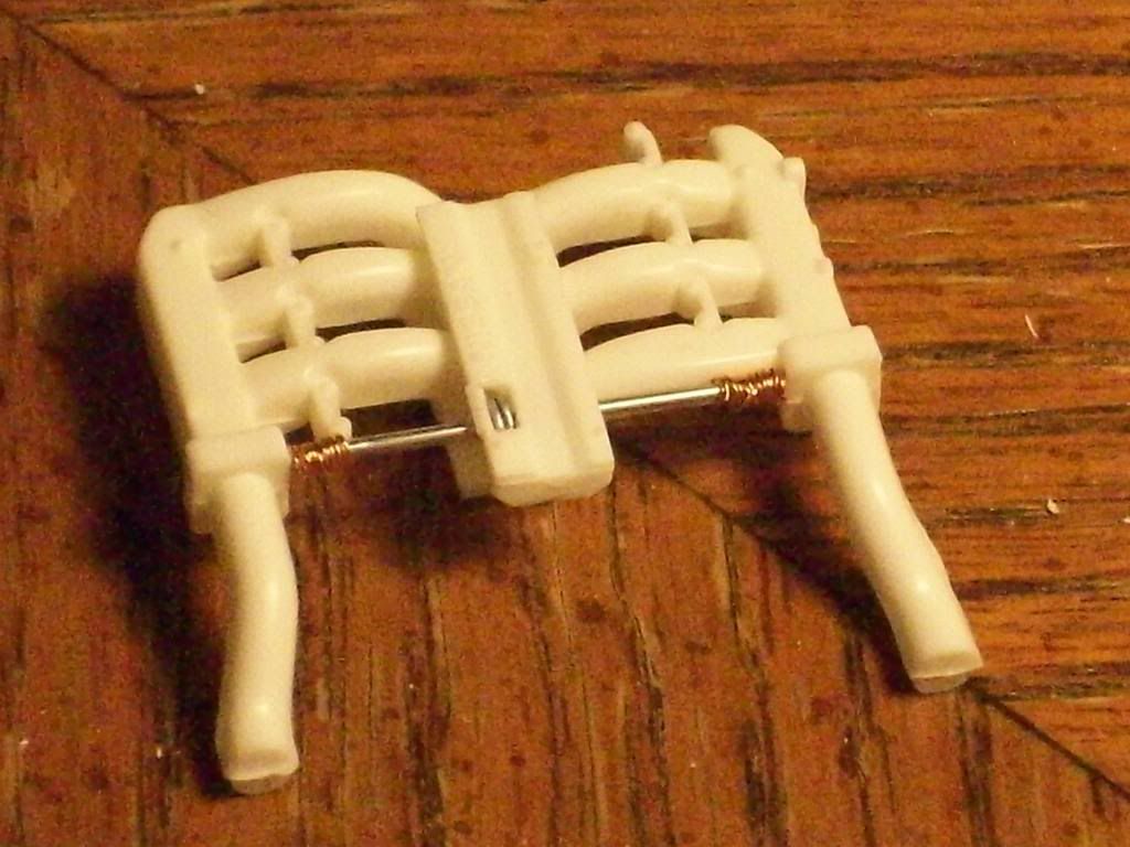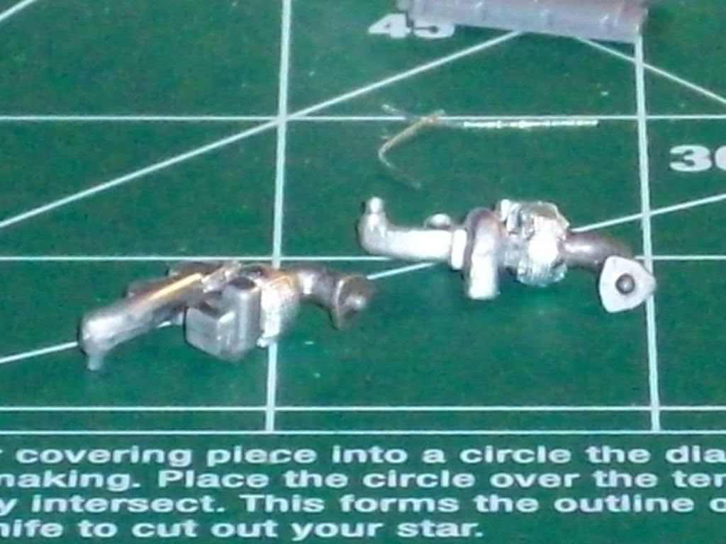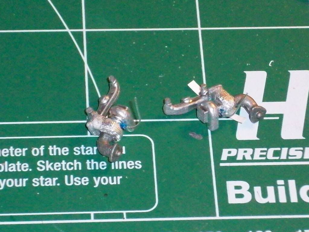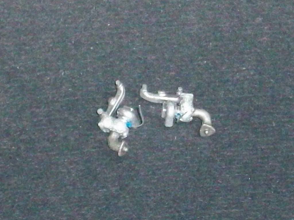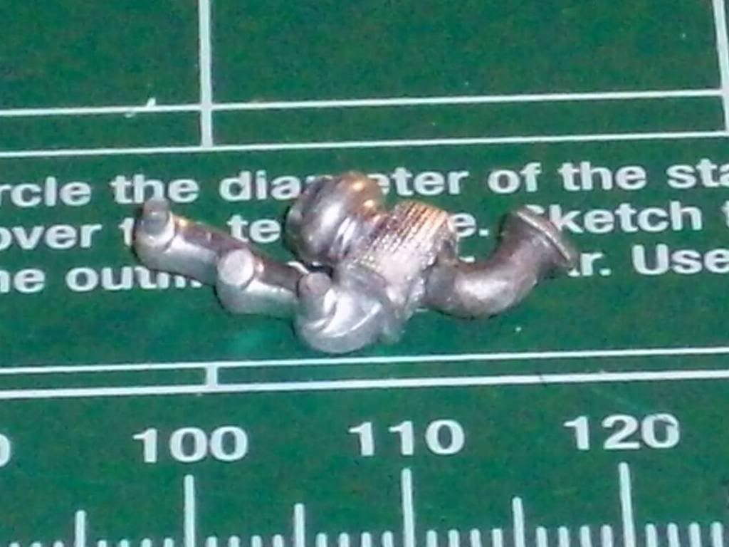 I'll trim those long "legs" when I decide exactly how I'm going to plumb these. I'll probably bend them into 90* fittings and run braided line from them. I'll also run a black wash into the grooves as soon as the silver paint dries.