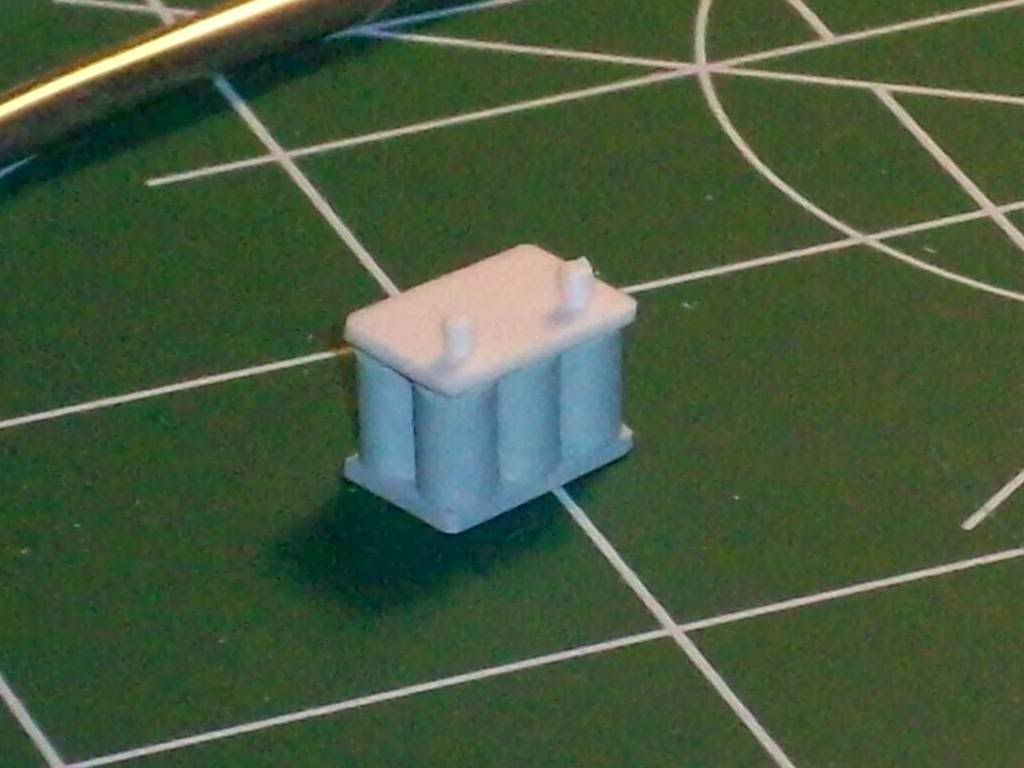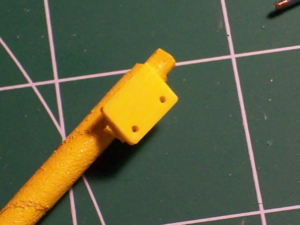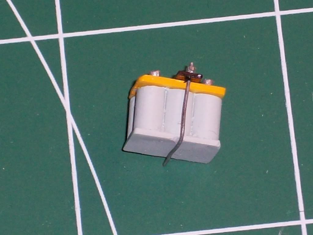 Step 6: Cut two lengths of styrene rod (about 0.050" diameter...I just used more kit extras) about the same length as the tubes you cut earlier. These will be the battery posts and will help center the lid on the battery. After you do this, drill two holes in the lid to accept these rods. This is a dry-fit with all parts: