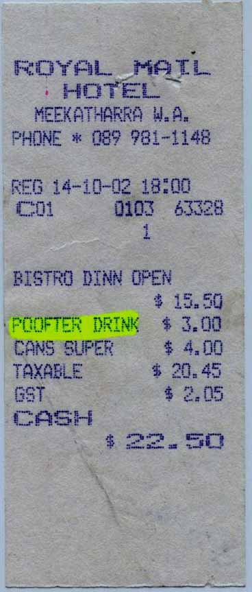 God I love you city slickers.Next time you are passing the Royal Mail Hotel in Meekatharra,the first one's on me.As long as it's a real drink.