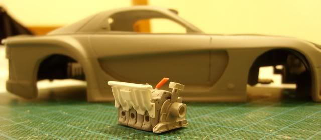 I didn't like Tamiya's standard engine bay, so I made a new one. :-P Still more touching up to do on it. Much more accurate than standard one. Ummm, ye, here we go.