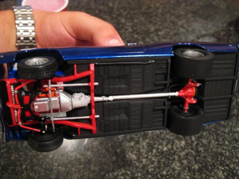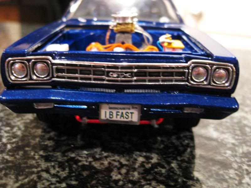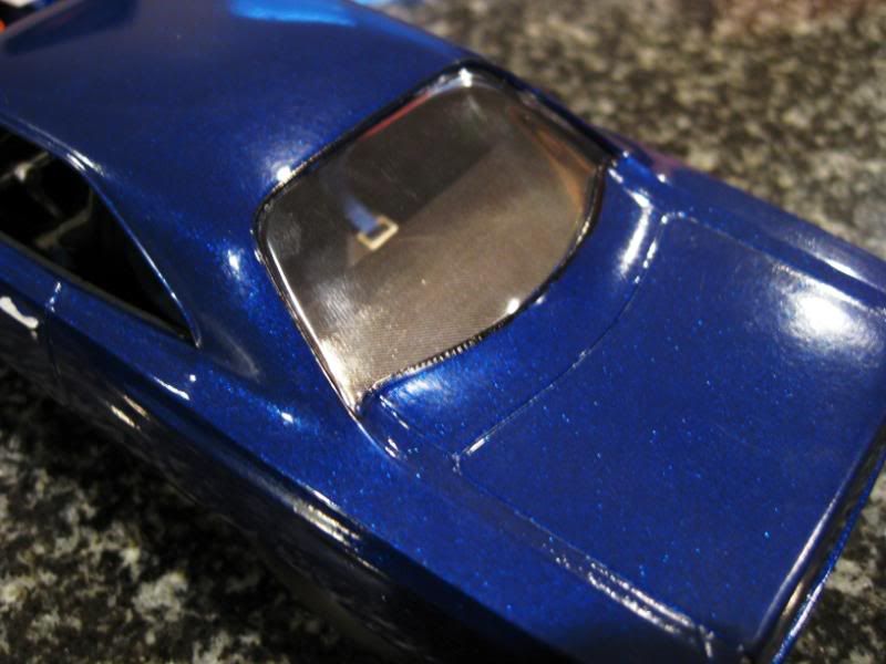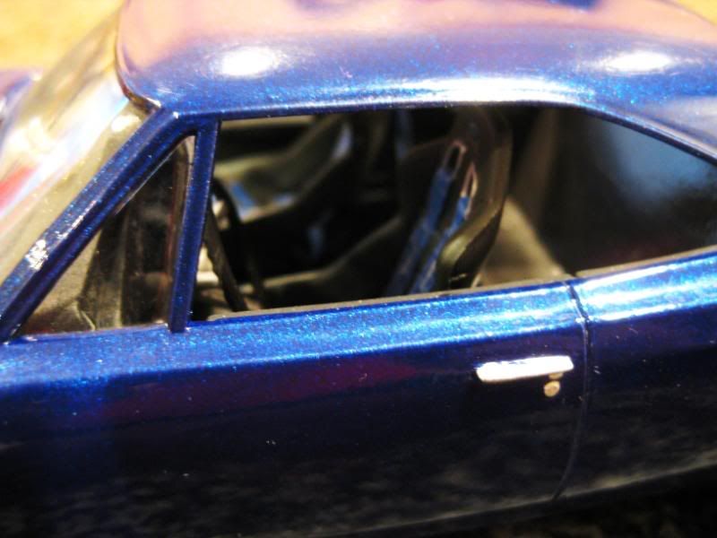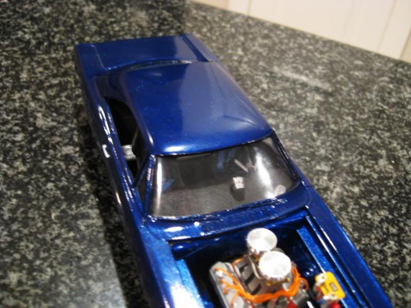 I think you did a great job. The engine bay looks flawless. Optima battery came out sweet. I see you used testors new laquers, it seems like you have a little orange peel or too much base paint as the flakes look a little too thick. How are those laquers to work with? Also you should bmf the window trim around the sides (small windows). Nice muscle though, i would burn out in that thing anyday!
