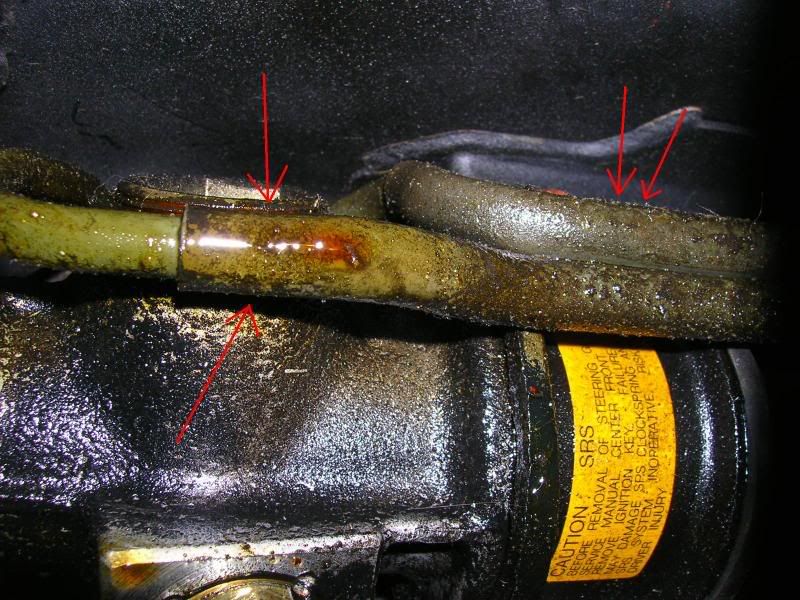 I had my pops turn the car on and turn the wheels back and forth but there was no squirting of fluids when I was down there. No droplets, no nothing...DOH! Anyone have any ideas!?! :(