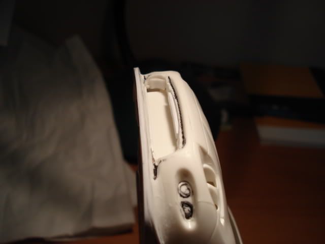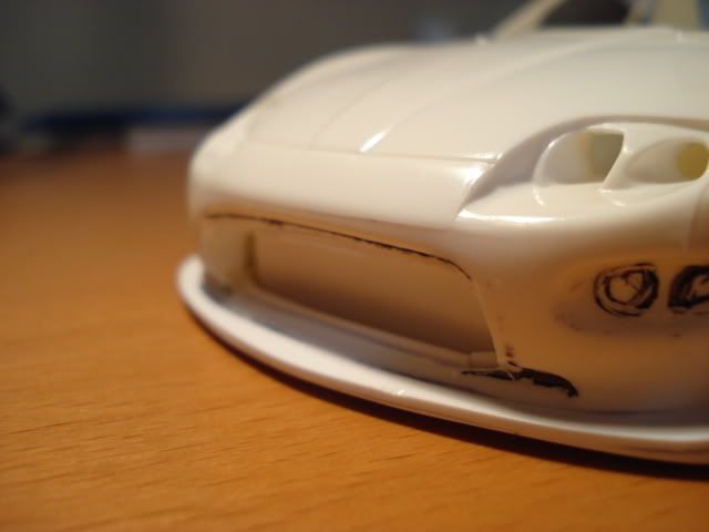 Added the inside wall to give the hole some "thickness" before applying putty of any kind. The kit had the early model front lip engraved on the lower front bumper, which I now removed with a carving knife.