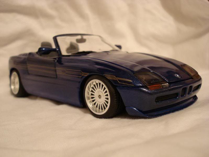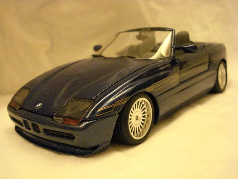 Basically a 1/24 Revell BMW Z1 painted with Tamiya Racing blue and coated with TS pearl clear. Scratch build front spoiler and seat belts, lowered and sitting on Alpina wheels (fitted with Chikichiki stretch side wall tires). Alpina decals are again from a Fujimi BMW Alpina B10 kit. Enjoy :)