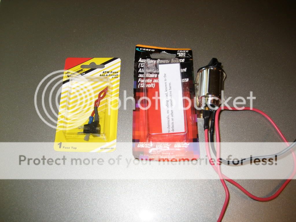 These are the items I used to make a SWITCHED power source. I went to the fuse box under the glovebox and found a switched fuse. I then piggybacked the add a fuse to this power source. I then plugged in my auxiliary power source and mounted it to a dash location. You can buy theses items at Auto Zone.