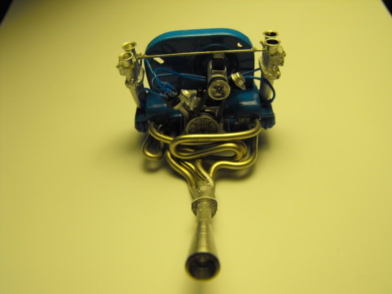 i made the header out of 1/16 solder, had to solder/melt the ends where it came together to make it stay in place. then added the stinger muffler. added spark plug wires, there's a lot of blue in there. but that's how the cali bugs do it, color match. :D
