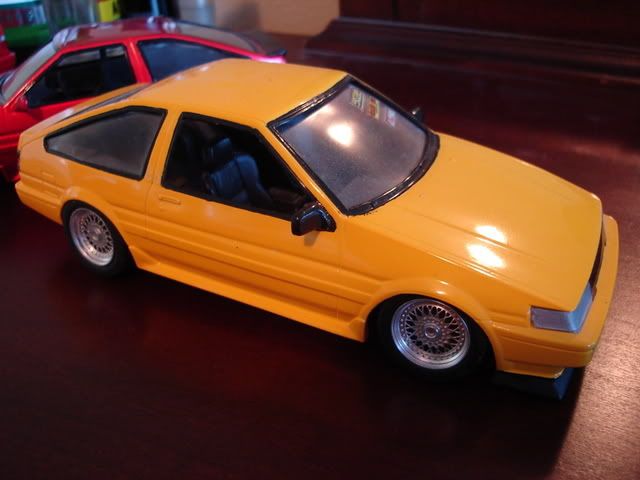 These three were prior builds that I redid. The E36 is made to resemble my E36 325i that got totaled in an accident 9 years ago..The yellow AE86 has the same paintjob but i redid the window gaskets, rear tailights, added front lip and wide BBS RS's. The orange AE86 used to be gunmetal gray. First i laid on bright gold as the base, then tamiya mica red. I didnt know how it would turn out but i loved the results...