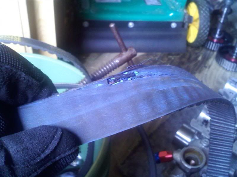 Looked at the timing belt, and kind of glad I decided to buy a new one... this one is beat up pretty bad. The metal in the belt was popping out here, and some other small tears and rips in other places. I really need a timing cover, but cant find one anywhere. I'm going to buy a bunch of sheet metal and make a custom one. I have some drawings on what I want, but I know it's all going to change once I actually start on it. Should be fun.