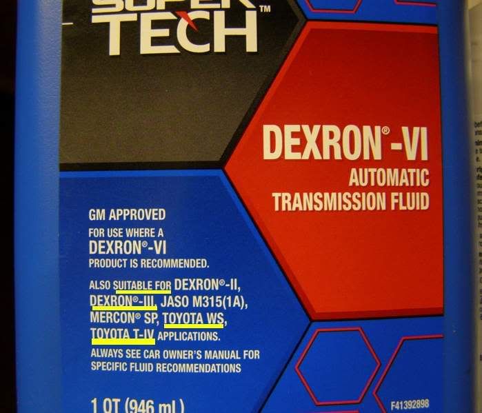 This may come as a surprise and evidently my friendly Scion dealer parts dept did not know the 08 Scion manual specifies WS tranny fluid. WS = World Standard which supercedes T-IV. I read a lot of forum discussions and one said they checked WalMart and the new Dexron VI SuperTec WalMart brand meets Toyota WS spec. http://i5.photobucket.com/albums/y189/mastertech/supertech.jpg I reckon that proves it.