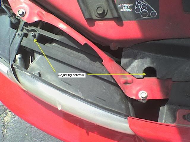 There are two adjuster nuts (one for vertical, one for horizontal) on the headlamp assembly that you access from the top. I had a pic at one time, let me see if i can dig it up and I'll post if for you.