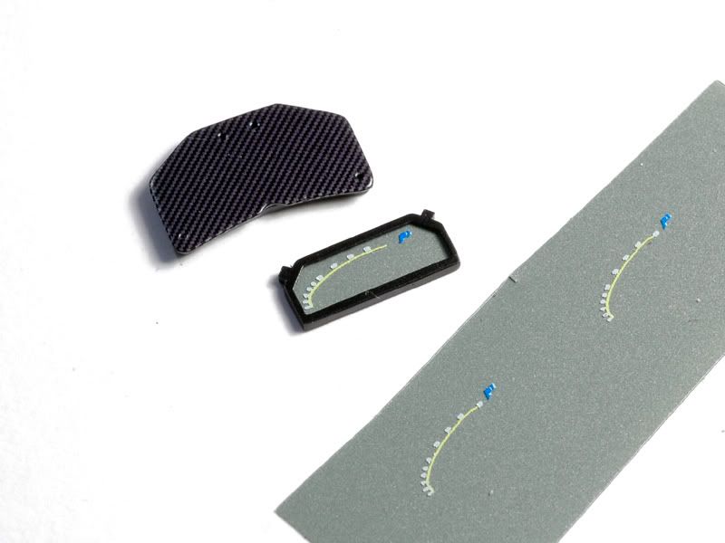 The parts were again painted and CF’d. For the display itself I designed the graphics ( that are printed/stickered on the real display as well ) along with the etching graphics and printed them on transparent overhead film with an ALPS printer. I then sprayed the film from the back side with a mix of moss green and silver. After cutting this out I could place the display face inside the etched frame.