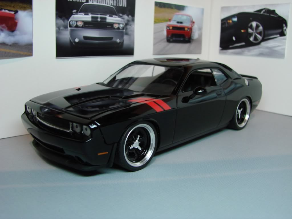 Just finished my version of the new Dodge Challenger. Kit is from AMT. I painted black Tamiya and added Pegasus wheels. Very nice kit even if is a curbside. I got the revell version with more details....so I will post the result... :)