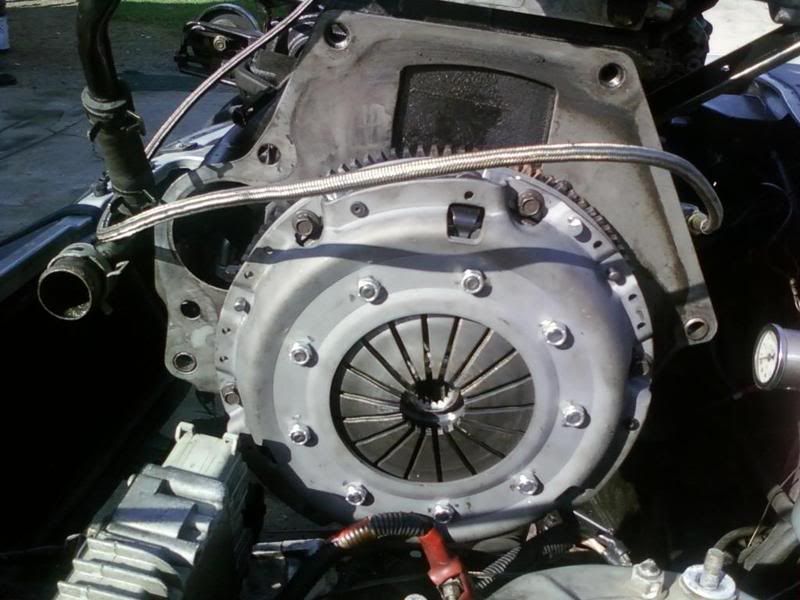 The bad: Putting those washers under the plate lifted it to much and now I have lost all of the plate load and the clutch slips when you boost the car at all. So basically the new clutch is worse than the other one. This was pretty much the last option we had for a zoom clutch so now Im buying an ACT 2100 pressure plate and using that with my flywheel and disc I have now. ACT disc suck so Im not using theirs. So the motor is coming back out in about 2 weeks to get it changed again. :(