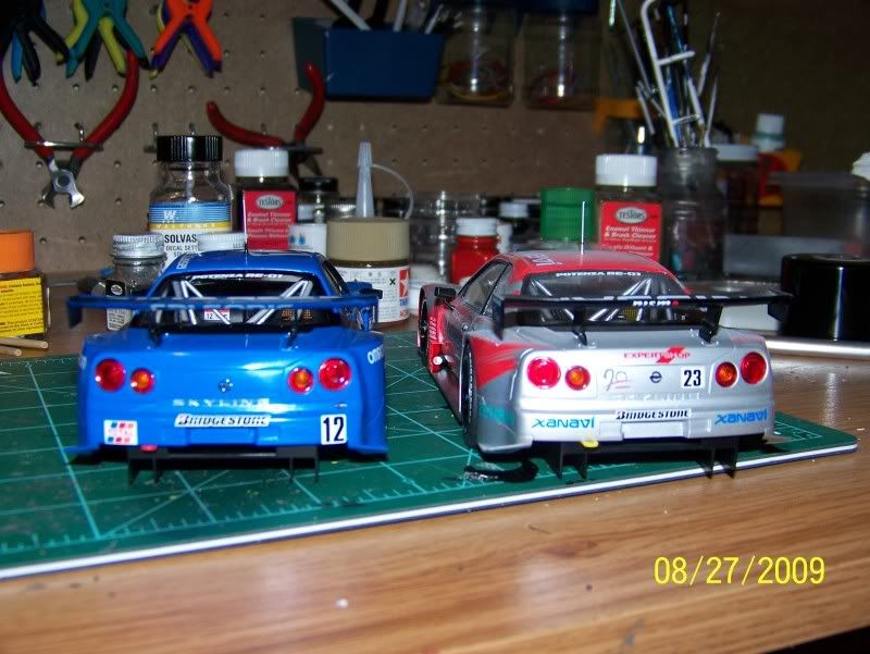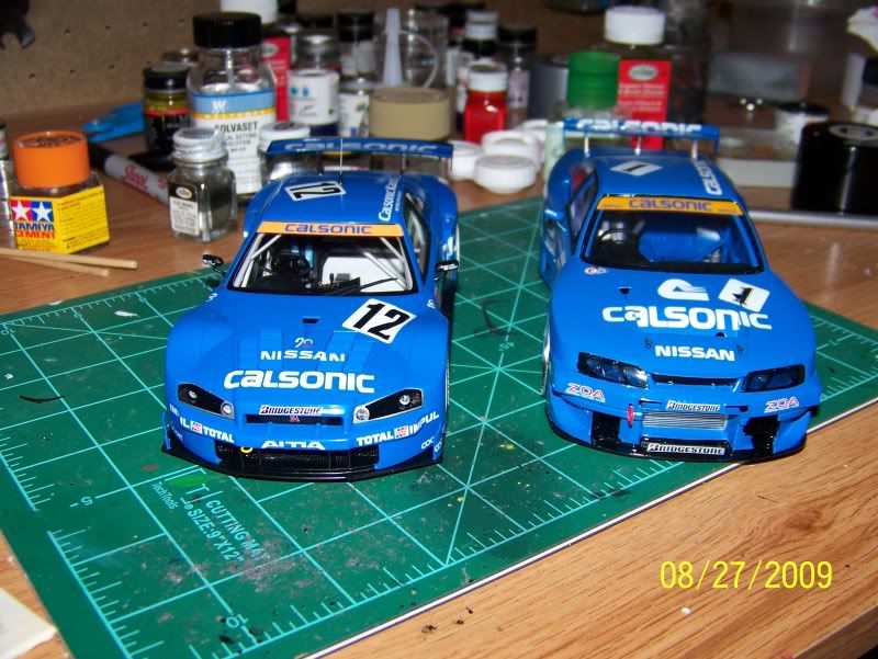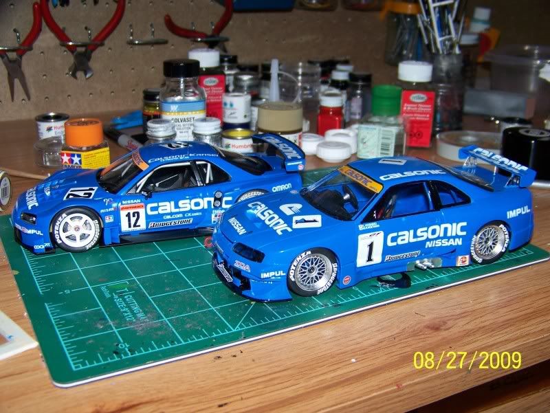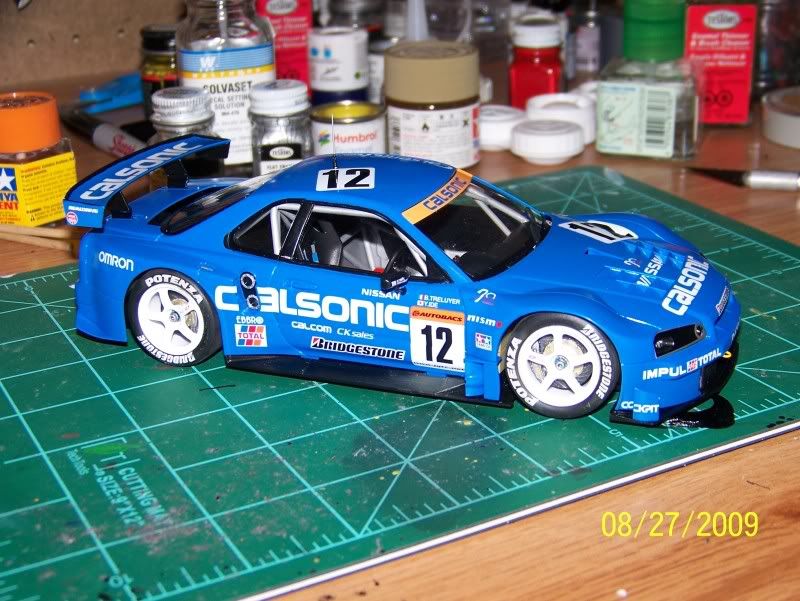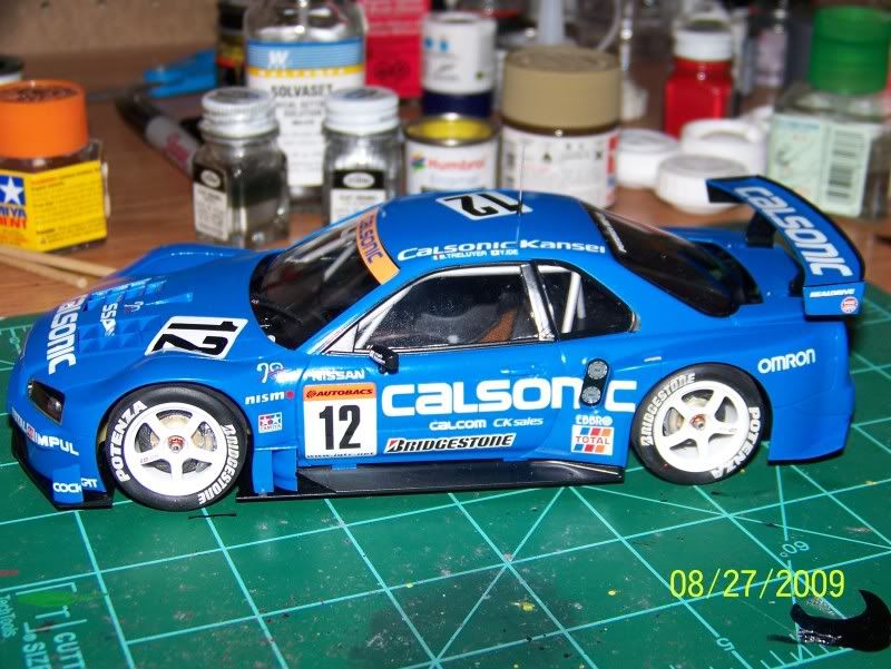 Here is my latest creation. Tamiya kit was built from the box with the exception of Crazy Modeler Tyre logos and an antenna from piano wire. Paint was Tamiya TS-44 polished but not cleared. I prefer that my race cars not have a "perfect" complexion. Light weathering around the exhaust to hide a smudge from dropped glue. The pictures aren't the greatest, but they'll do for now. I have learned 2 things... 1.I want to build more of the GT-R kits and 2. I want to build more Calsonic cars. Both are a blast to work on and I've made a list of the available Tamiya GT-R and Calsonic kits and I plan to try to work my way through them.