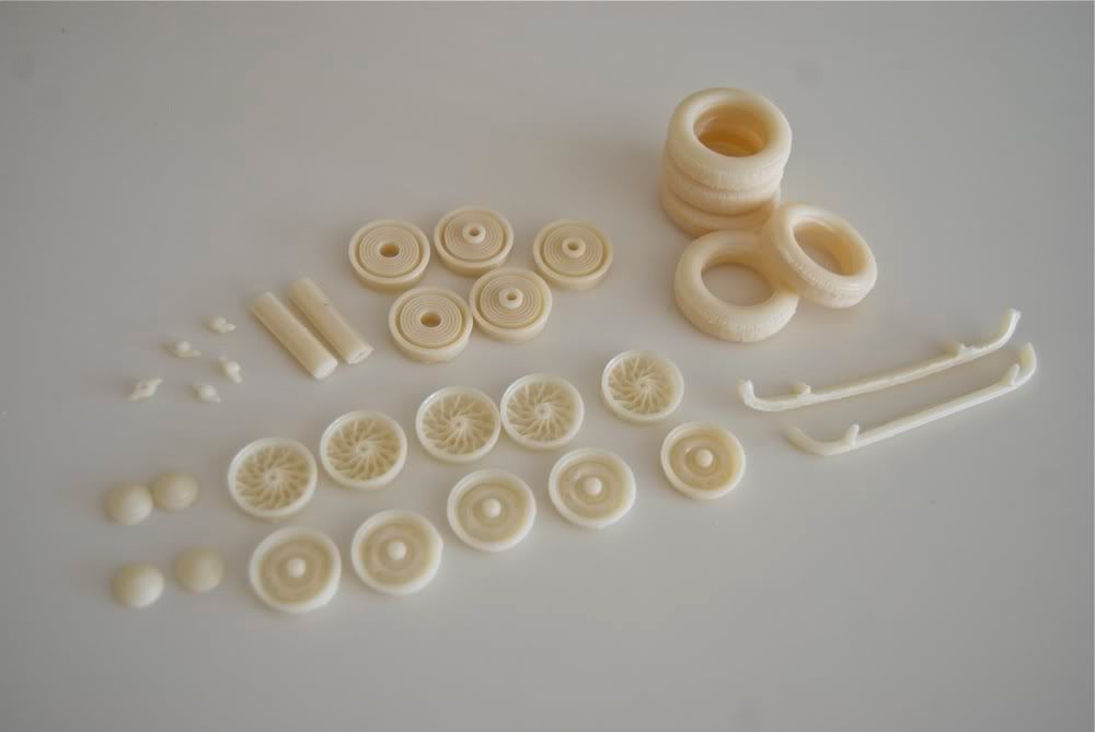 Most interesting fact is that wheels are also resin, including tires. Wire wheels are modified copies of Academy 250LM wheels, but there are also steel wheels that were fitted to the car at some point, so you could choose. There are alos bumpers, exhausts, and brake drums, plus few other little bits.