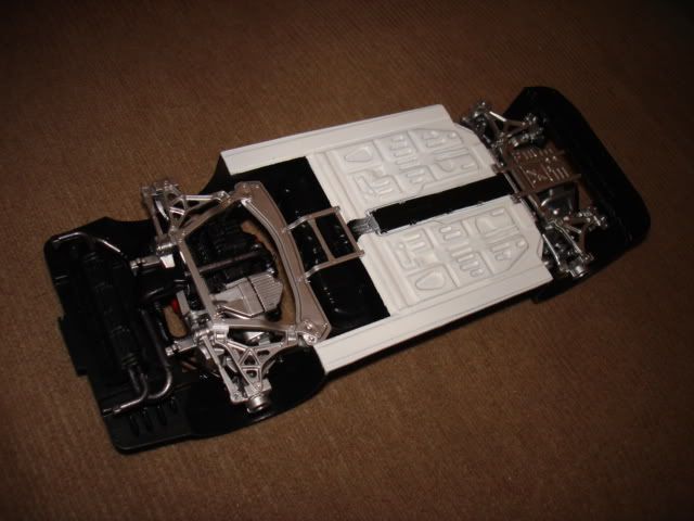 Chassis update. Tamiya chassis with front end and silver & black plate from Fujimi kit. Also brake rotor/calliper from Fujimi.