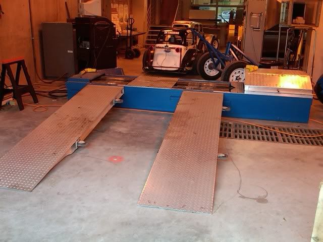 Our school has had this dyno sitting in the mech. engineering shop, it hasn't been used in years. Well some of us found out about this thing and got permission to hook it all back up and use it when ever we want to. We pulled it out today and spent most of our time just trying to position it back where it needs to be. We fired up the computer system also to make sure it all still worked. Everything seems to be working fine, dyno is still wired up so we could spin the wheels and get reading on the screen so it appears to be working. We will be working on it some more this week, finish setting it up and doing some maintanence work. Also calibrating the dyno again. Hoping to have it up and functioning sometime next week.
