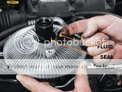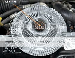 The fan clutch operation is regulated by a valve that is opened and closed by a thermostatic spring. The valve controls the flow of a viscous silicone fluid between chambers in the clutch assembly. When the engine is cold, the clutch is essentially disengaged, which is why the fan runs at its slowest compared to the engine's speed. As the engine warms up, the air flowing to the fan assembly becomes hotter. The hotter air causes the thermostatic spring to unwind and open the valve. Silicone fluid from the reservoir chamber flows into the main chamber, engaging the clutch, and the fan spins faster (though it's still slightly slower than the engine).