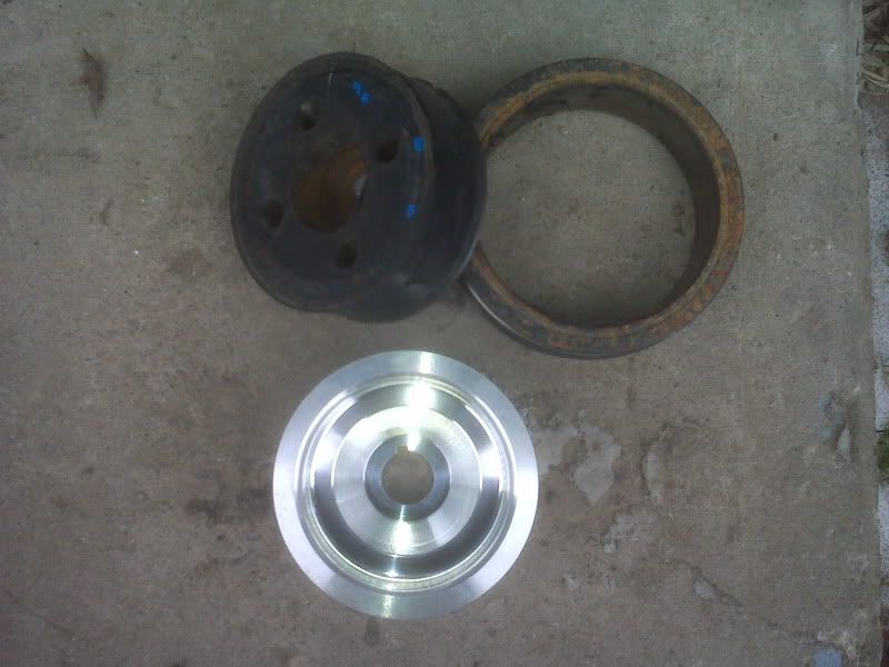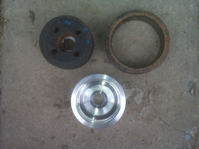 Alright, got the pulley yesterday and started pulling stuff apart today. Took about 30 minutes to get the thing out. The bolt was so tight that when I tried loosening it, the engine would rotate so I couldn't get it loose. So I took a breaker bar and pushed it against the frame and had my wife turn the engine over to get it loose. Worked perfect. Got the pulley out and as you can see, the old one is now in 2 pieces (de-lamination). Couple pics, and I'm off to get some belts.