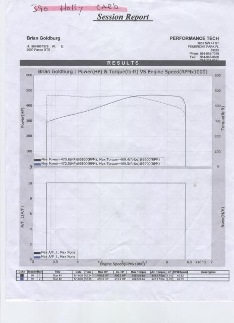 Attached are the last dyno sessions we did with both 390 carb and the 650 carb. As you can see from one car to the other and from dyno to the other the results VARY. This really annoys me since my class in NASA is a dyno based racing league and I cannot tune with any kind of confidence. Could you imagine me dyno tuning the car in Florida, buying a special built carb to get as close as you can to the allowed limit and then go to nationals in Utah and their dyno reads illegal? Now what? When we got dyno checked in Ohio at nationals their dyno read 420 RWHP with the 390 carb which is 30 HP less than the "SAME" dyno in Florida.