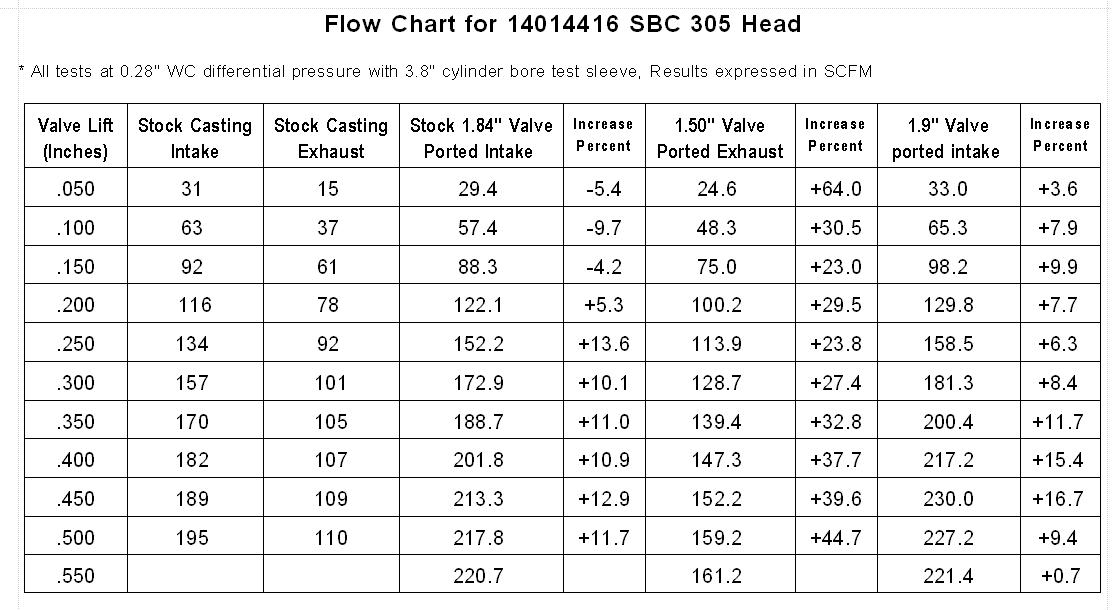 And cam selection will be crucial. The factory, despite all our lambasting, seemed to know exactly what it was doing when it installed all those "peanut" cams in 305s. The measured head flows didn't improve much at all above 0.400" lifts, so a higher lift cam does almost nothing with stock heads. It is more important to get the valves opened and closed as quickly as possible to the 0.350-ish range than to open them to 0.550" where flow is really not significantly better than at 0.400":