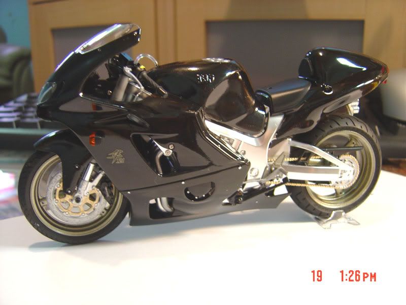 This is Tamiya's Honda CBR400F painted with TS14 Gloss Black, the frame is TS30 Silver Leaf. It is built box stock, the head light looks crooked but it doesn't turn with the forks on this bike.