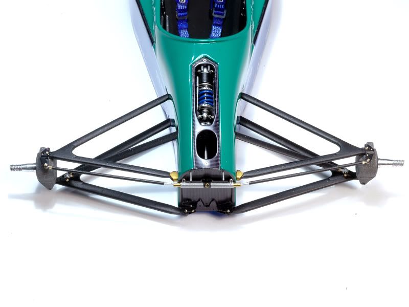 You can also see the little turned aluminium pins above the steering which will hold the nosecone. I didn’t just use wire because over time that might work loose and get pushed backwards. These pins have a slightly wider ring machined in where they enter the monocoque so this won’t happen.