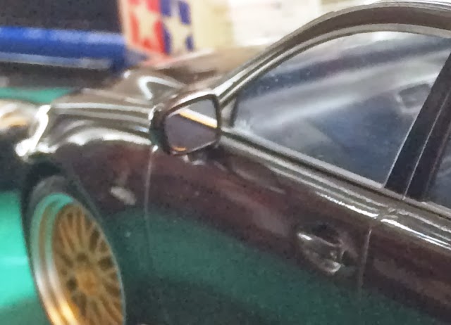 Fujimi's genuine chromed mirror parts shows good reflection, too. I set 0.5mm plastic rod in the mirror stay, and same 0.5mm hole were drilled on the body side, then used the clear bond. It's stress free when I use the clear bond, no need to worry about harming the body paint!!