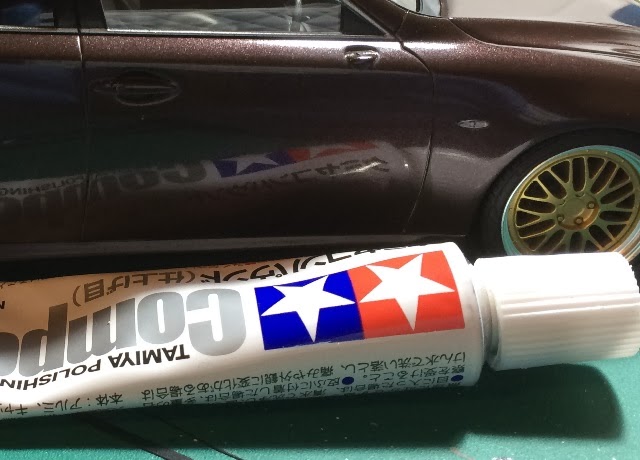The final polishing has been held with Tamiya's finishing compound. I tried to do this after attaching almost everything to the body, because I would touch the body too many times so that bunch of fine scratches would be made. This trial went so well, I could skip one polishing process so I could prevent cutting through the clear coat.