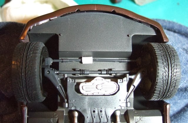 Then covered by this part. Actually I can't see anything under this panel so I didn't need to paint that pipe...? BTW, this cover part showed "Ultra-fit" between the body and chassis, so I recommend you to fit this part after docking the body and chassis to make their docking easier. I happened to do so (I did all the suspension, wheels and tires after docking them because I wanted to hold the chassis surely when docking to the body. Also it was good to adjust the balance between the body and the wheels.